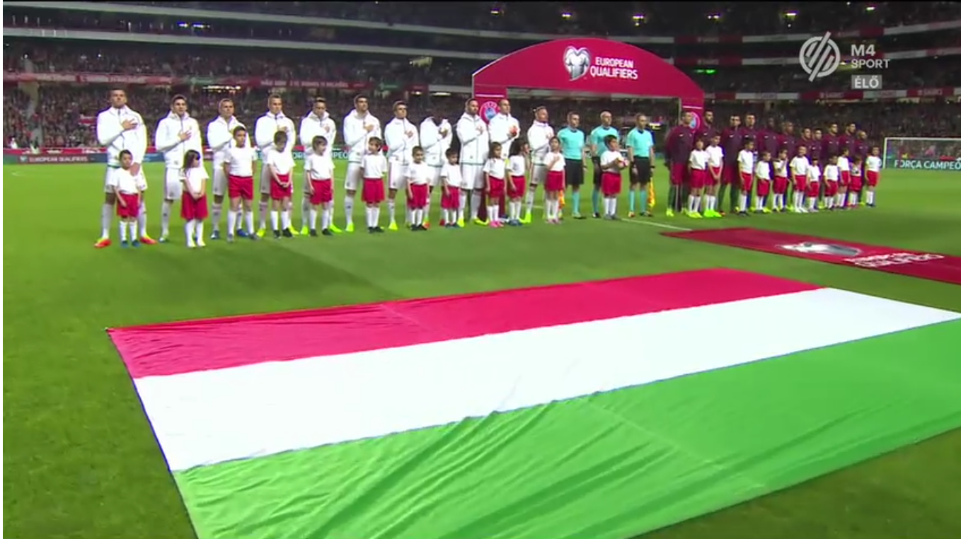 A félidő eleje lassan indult, a 7. percben Ronaldo kapura fejel, de mellé ment, viszont itt már látszott, hogy nem adják könnyen magukat. A 10. percben Cédric kapura fejelt, amit Gulácsi könnyen megfogott. Ekkor a 12. percben Vinícius Paulo szabálytalan volt, a portugálok jöttek szabadrúgással, amit Ronaldo lőtt el, ám fölé ment, de a sorfalról pattant meg, így szöglet következett. Quaresma végezte el, de könnyű labda volt. A 18.percben újabb portugál szöglet, ismét Quaresma a labdánál, de Gulácsi megfogja. A 20. percben Quaresma beadása Ronaldonak, de a fejelése mellé. A 31. percben megtört a jég, portugál gól született. Guerreiro szép passzt adott, amit André Silva gólra váltott be. Nem sokkal később a 36. percben André Silva visszateszi az érkező labdát és Ronaldo a bal alsó sarokba belőtte. Hosszabbítás nélkül, két gólos hátránnyal megyünk pihenni.
