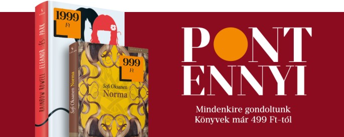 Kizárólag a narancssárga címkével megjelölt könyvekre érvényes a Pont ennyi akció, amelynek keretén belül 499 Ft, 999 Ft, 1499 Ft valamint 1999 Ft-ért vásárolhatóak meg az olvasnivaló kötetek.
